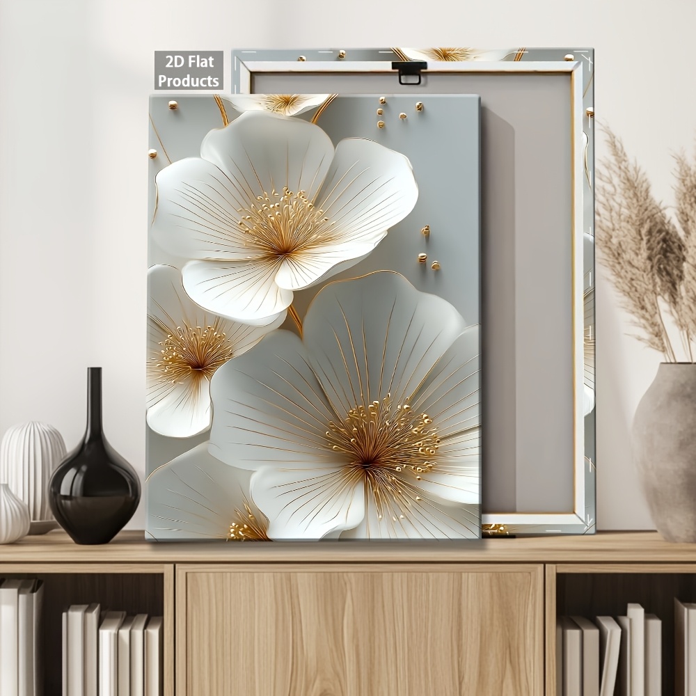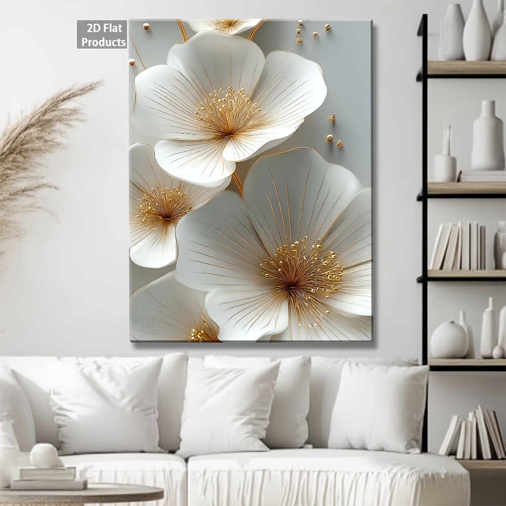 2D Flat, 2D Flat, 2D Flat A Single Piece of 2D Flat Decorative Art Featuring Wooden Frames, Showcasing White Flowers Outlined in Golden. This Wall Art Poster Is Designed for Horizontal Display And Is Suitable for Living Rooms, Offices